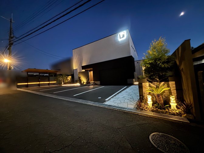 N様邸新築には、日々お客様が来られるとのことで、車を止めても窮屈に感じないように、駐車場部分を広く確保し、外が暗くなる時間帯の安全面を考慮して、数ヶ所ライトを設置しました。